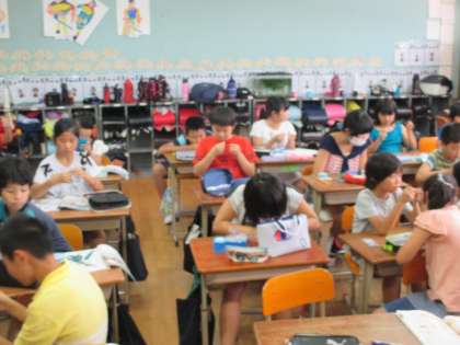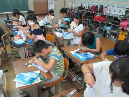 裁縫セットを使っての学習です。子どもたちは大喜びです。まず,針に糸を通し,玉結びをします。これがなかなか難しい。出来た子がどんどん教えてくれます。次は波縫いです。これも難しい。慣れが必要です。