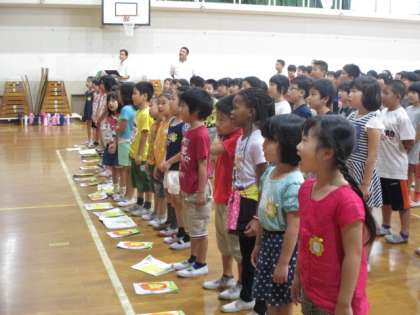 まず初めは全校朗読です。「ことばのけいこ」を全校のみんなで声をそろえて朗読しました。しっかり練習してきたので,リズムよくはっきりと読むことができました。