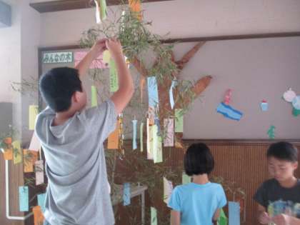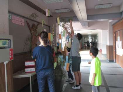 えのき学級では,掲示委員会が企画した七夕の願い事短冊に,お願いを書いて飾りました。いろいろな色の短冊をみて,どこに飾ろうか楽しんでいる様子でした。お願いがかなうといいですね。