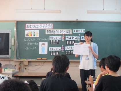 今日は栄養教諭の先生に来ていただき,普段よく口にしている「清涼飲料水」について学習しました。いろいろな清涼飲料水に含まれている砂糖の量を予想したり,実際に飲み比べたりしました。思ったより多くの砂糖が含まれていること,温度によっても甘さの感じ方が違うことなどに気付いていました。今日学んだことを自分の生活に生かしてほしいと思います。