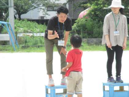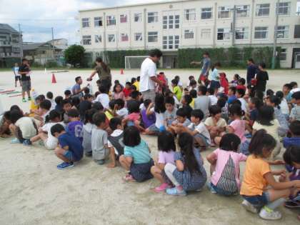 ロング昼休みの時間に,スポーツ委員会が障害物リレーを計画してくれました。ぐるぐる回ってから走ったり,ネットをくぐったり,先生とじゃんけんしたり,みんなで楽しくリレーすることができました。