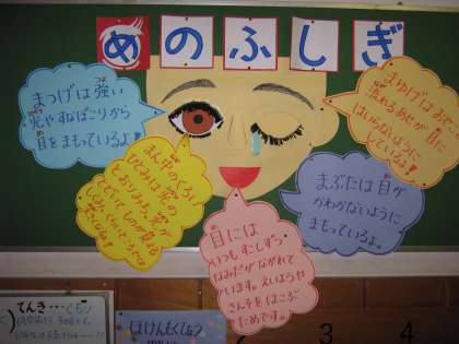 今月の掲示板は,『目のふしぎ』についてです。目の上にある眉毛の働きは,目に入る汗を止めてくれます。まつげの働きは,目に入るほこりを防いでくれます。目の周りにはいろいろな働きをする部分があることがわかります。