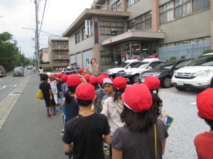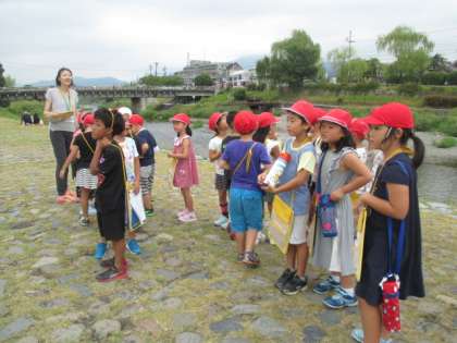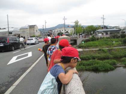 賀茂川と高野川の合流地点の三角州では,「あ!マラソン大会で来たところだ!」と嬉しそうに言っていました。季節が違うと河原の景色もずいぶん違います。橋から川を眺めて,帰り道につきました。下鴨警察署の前を通ったら,学校まではもうすぐです。