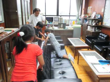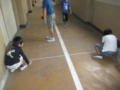 今日は長さのはかり方の学習をしました。巻尺を使って色々な長さをはかりました。ある班は校長室のソファーの長さをはかっていました。