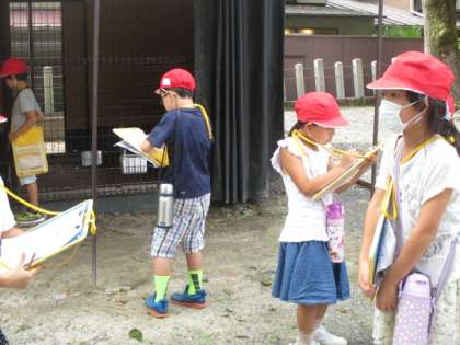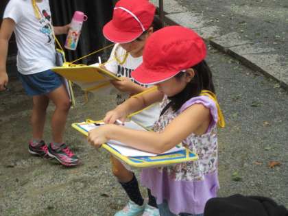 探検ボードが大活躍!探検していて見つけたことを忘れないようにメモしました。先生に見つけたことを報告する姿もありました。
