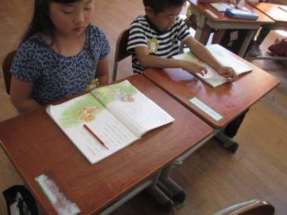 国語では『ゆうやけ』という物語の勉強をしています。今日は,きつねの子やくまの子,うさぎの子がどんなことをしたのかを読み取りました。とってもやさしい気持ちになるお話ですね。