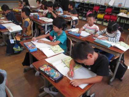 2年生も国語でファンタジーのお話を学習しています。今日は,自分が「おもしろい」と思ったところや「不思議だな」と思ったところをノートに写して,紹介し合いました。ファンタジーの不思議なおもしろさを見つけて,楽しそうにしている子どもたちでした。