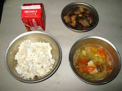 今日の給食は,麦ごはん・牛乳・牛肉と大豆のみそ煮・はくさいの吉野汁でした。牛肉と大豆のみそ煮は,牛肉がほどよくやわらかく、みそが全体にからみ合っていておいしかったです。