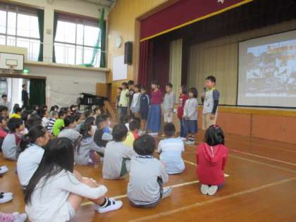今日で前期が終わりました。校長先生からのお話や前期学級代表のふりかえりなどをしました。子どもたちは,集中して聞いていました。