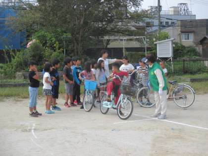 今日は自転車教室がありました。4年生にある検定に向けてコースを回ったりホワイトボードを使って交通ルールを教えていただいたりしました。