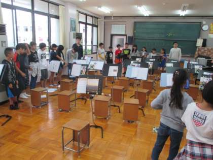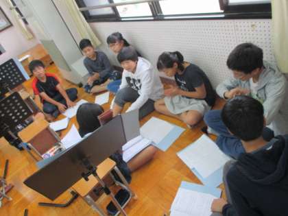 6年生にもなると,リズムを打つだけでも難しいものに挑戦しています。3つのグループに分かれて,それぞれちがうパートで練習しました。最後には練習したことを生かしてみんなで音を合わせました。きれいに音が重なっていました。