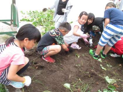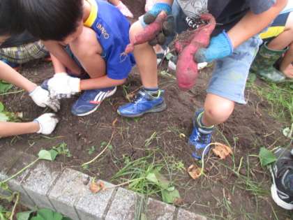 春に苗を植えた「サツマイモ」の収穫の季節になりました。みんな葉っぱはいつも見ているけれど,土の中でどうなっているかは想像していなかったようで,立派なお芋がたくさん出てきてびっくりしていました。えのき学級との交流で,このお芋を使う予定です。楽しみですね。
