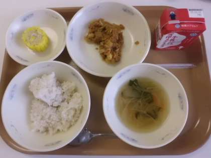 大豆とツナのドライカレーは,ごはんにのせて食べます。大豆がいつもは苦手な子でも,とってもおいしいと喜んで食べていました。カットコーンは,あまくて美味しいという声がたくさんあり,好評でした。コーンの甘さとプチプチした食感を楽しむことができました。