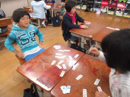 ひとけた+ひとけたでくり上がるたし算を勉強してきました。今日はカードを使って,楽しくたし算の学習をしました。友だちに問題を出してもらって,5秒で答えられるように頑張りました。