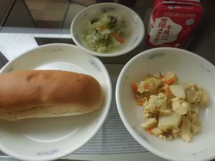 変わりいり卵には,卵・ベーコン・じゃがいも・たまねぎ・にんじんが入っています。卵はふんわり,じゃがいもはホクホクしていましたね。野菜もたっぷりとれる一品です。味付けは,塩コショウでシンプルですが,ベーコンや野菜からうま味が出るのでとても美味しくなります。おかわりをした子がたくさんいました。