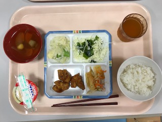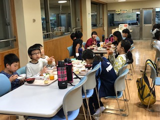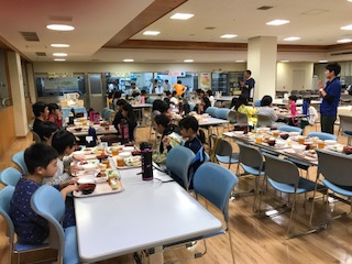 山登りも無事終わり,入浴した後,少しゆっくりして夕食です。昨日は野外炊事だったので,最初の宿舎での夕食です。山登りの疲れか食が少し進みにくい子もいましたが,ほとんどの子が大好きな唐揚げをしっかり食べていました。
