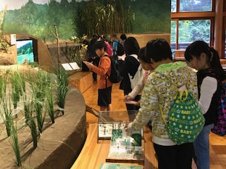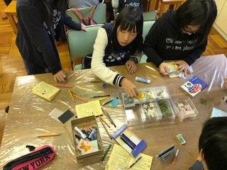 自然保護センターの見学では,グループでクイズを考えながら館内を回っていきました。子どもたちは展示室のはく製や水槽の生き物などを興味深く見学しました。後半は花びらや葉っぱを使ったしおり作りをしました。