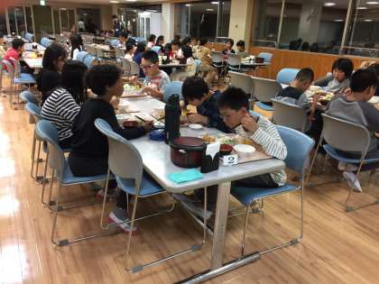 奥越高原青少年自然の家での最後の夕食です。子どもたちは,昼食に芋ぼた、おやつにピザ等たくさん食べたのですが、夕食は夕食でしっかり食べました。食べることは元気のもと!子どもたちの明るい笑い声が食堂に響いています。
