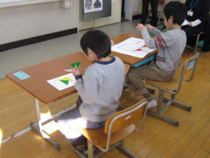 三角形,四角形,円の学習をしました。学校の中の三角形,四角形,円をいっぱいさがしました。この日は,三角形や四角形,円を仲間わけしたり,形あわせをしたりしました。また,色や大きさの違う三角形,四角形,円をいっぱいならべて指示された形を取り合うゲームをしました。