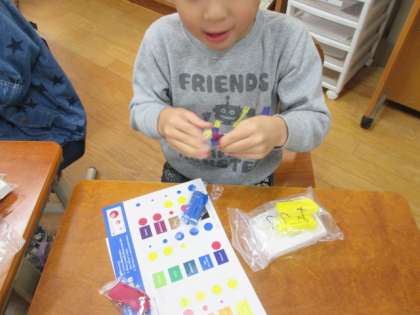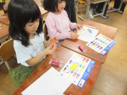 図工の時間にカラー紙粘土を使ってごちそうをつくりました。カラー紙粘土の色は,紅・黄・青・白の4つです。この4つの色の組み合わせで,様々な色ができます。みんな楽しんで色を作っていました。