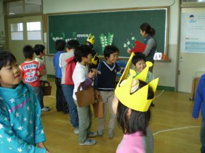 11月17日に2年生で英語活動を行いました。「“Fruit Basket”を作ろう」という単元にしました。What do you like?’I like ~とフルーツの王様と英語でやりとりしながら、フルーツを集めて自分だけのフルーツバスケットを作りました。とっても上手に英語でやりとりできました。