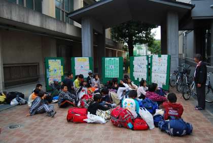 養正小学校に戻ってきて,解散式をしている様子です。掲示板には「おかえり」と言う文字と1年生から5年生までの子どもたちの6年生へのメッセージが書かれていました。疲れていたはずの子どもたちも,学校に着いたら掲示板に顔を近づけ,メッセージを読んでいました。