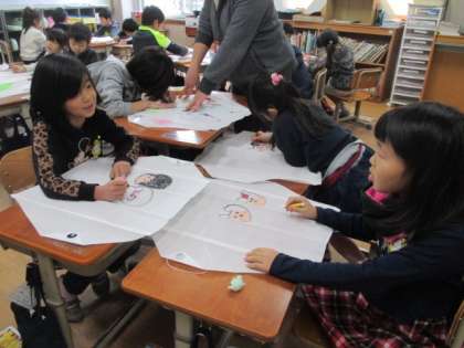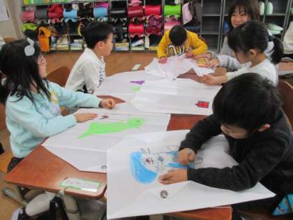 1年生と一緒に,凧作りをしました。クレパスで好きなものをぐいぐいと力強く描き進めていきました。それぞれ好きなものがしっかり描けました。しっぽをつけたり紐を結んだり上手に仕上げていきました。