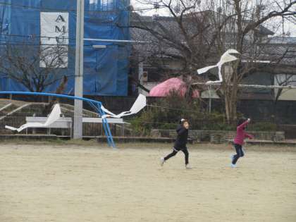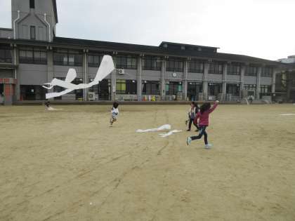 完成したぐにゃぐにゃ凧を運動場であげました。思いっきり走ると凧はうまく風を受けて高く上がります。今日はあいにく風のない日で,走るのをやめると落ちてしましました。でも,元気な1年生たちは汗をかきかき走り回って,凧上げを楽しみました。