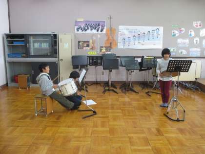 リズムアンサンブルのグループ練習です。リズムの重なりを確かめながら,練習をしています。リズムが合えば,楽器の強弱も工夫しながら,練習していきます。