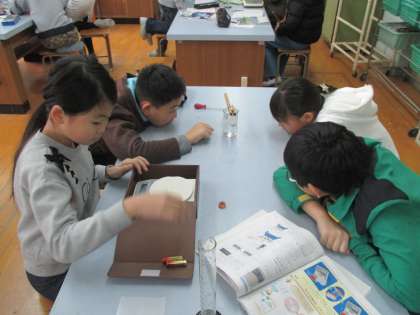 食塩を水に溶かしました。溶けていく過程で,もやもやしたものに気づきました。上から下に溶けていき,全体にひろがる様子がよくわかりました。