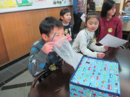 におい当てクイズやさわってクイズ,豆つかみなど,初めての体験にわくわくドキドキの1年生でした。30秒間にいくつつまめるか!一生懸命になればなるほど豆はあちこちへ逃げていきます。