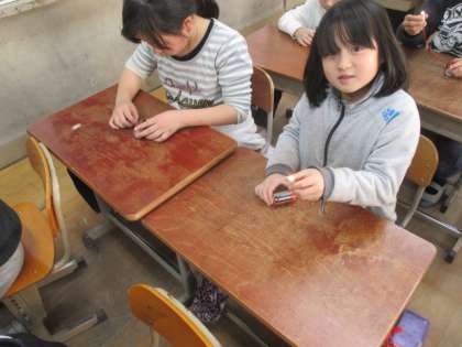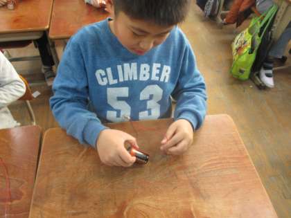 今日は電池を使って豆電球をつける方法を考えました。プラス・マイナスの関係を考えながら実験をしました。