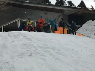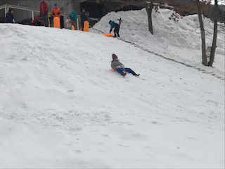 さあ,いざ雪遊び!山の家の宿舎の近くのスロープでそり遊びです。今日は晴れ間もありましたが時折雪のちらつく天気で,寒そうです。でも,子どもたちはそりをもってスロープを登っては降りてと,存分に楽しんでいました。