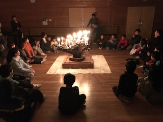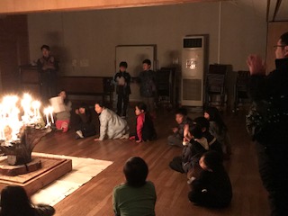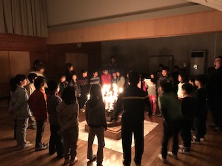 ファイヤーが始まりました。4人の火の子どもが灯したキャンドルの明かりで、静かにスタートしました。ジャンケン列車などのゲーム、○×クイズ、ダンスなどで盛り上がりました。司会の進行に協力的で、とてもノリのいい3年生です。とても楽しい思い出ができました。