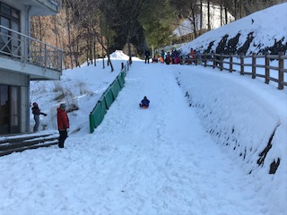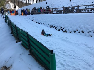 快晴の空の下、そり滑りを満喫しています。2日目ということで、怖さがやわらいだのか、みんなスピードにのって滑っています。子どもたちの笑顔いっぱいです。