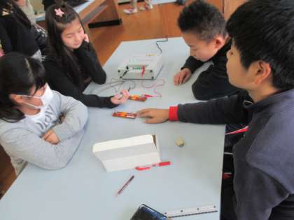 電熱線の太さによって発熱の仕方が変わるのかを調べました。実験の結果から,どのようなことがいえるのか自分でまとめを書いています。うまく書ける子が増えました。