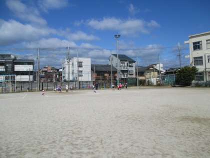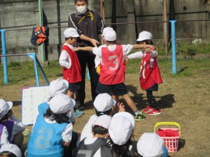 1年生の体育では今,パスゲームをしています。ボールをもっている人が動けないルールなので,ボールをもっていない人にうまくパスを回さなければいけません。チームで協力することが大切ですね。昨日の雨が嘘のように今日はとってもいい天気。子どもたちの声も心なしか大きく元気です。