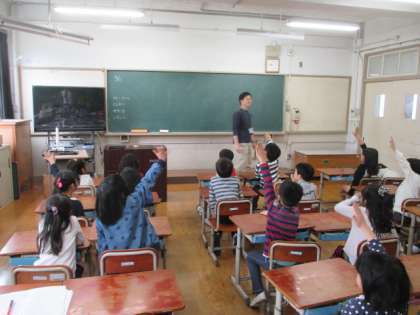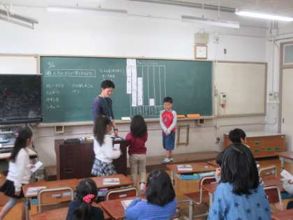 算数の学習です。給食のメニューで一番好きなものを聞きました。1位はダントツでカレーでした。あとは,とんかつやシチューが人気です。好きな人の数がすぐにわかるように表を今後作っていきます。