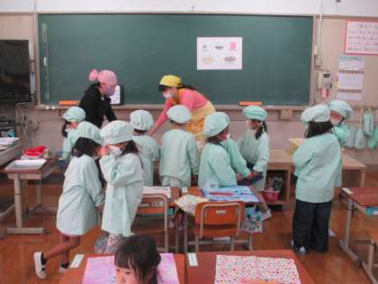 栄養教諭から,給食の準備の仕方を教えてもらいました。給食は,自分たちで準備します。エプロンは,給食当番が着ます。給食当番は,エプロンたたみ歌を口ずさみながら,楽しく準備していました。