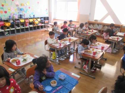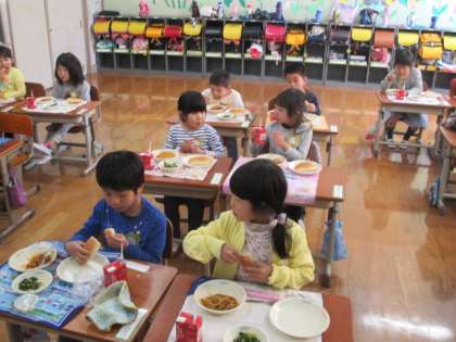 小学校初めての給食です。みんな大好きスパゲッティです。口の周りがミートソースいっぱいになりながら,食べていました。「幸せ。」とつぶやいている子もいました。
