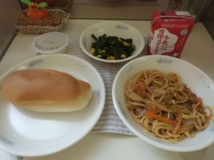 スパゲティのミートソース煮は,麺が伸びないように調理員さんが出来上がりの時間を考えて仕上げていました。また,ほうれん草のソテーに入っているコーンは,スチコンを使って蒸しました。「コーンがシャキシャキしていて甘かったです。」と感想が届いていました。