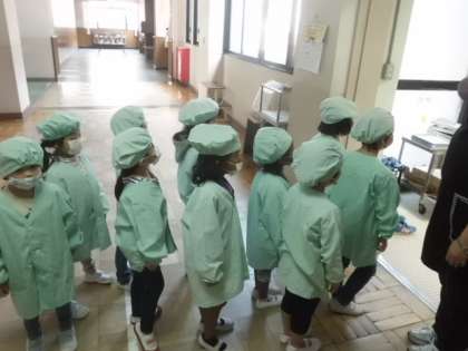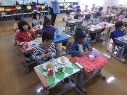 1年生も,エプロンをつけて給食当番の仕事をしました。大きな声でいただきますを言って,給食を食べました。「おいしかったよ!」と言いながらみんなで楽しく食べられました。
