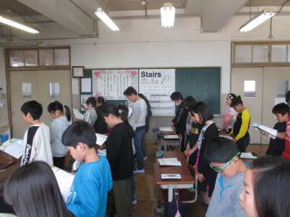 今日は発声練習や5年生で学習する歌の紹介をしました。5年生のきれいな歌声に驚かされました。