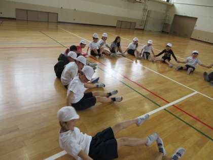 体育の授業で,みんなで手をつないで起き上がったり,寝転んだりして波を作りました。