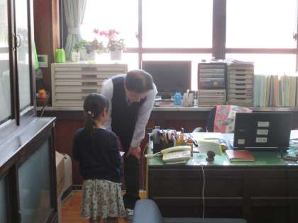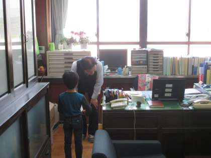 校長先生に名刺を渡しました。名前と好きな食べ物を校長先生に伝えました。緊張したみたいです。