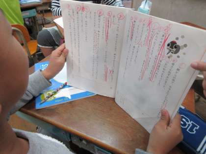読む速さや声の大きさ,間の空け方など,自分たちで気を付けたい所に線を書き加えながら,友達同士で読み合い・聞き合いをしました。