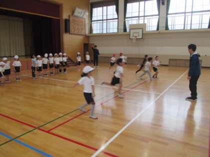 体育の学習です。先生とじゃんけんをして,勝ったら進めます。運とジャンプ力が勝負の決め手です。