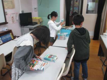 図書係が学級文庫の増刷に向けて視聴覚室で本を選んでくれています。近々学級文庫が増えるので楽しみです。