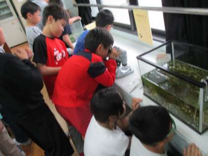 年度初めから育てていたメダカの赤ちゃんが生まれました。まだ卵のままのものもいますが、小ささに驚いていました。