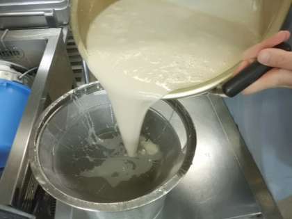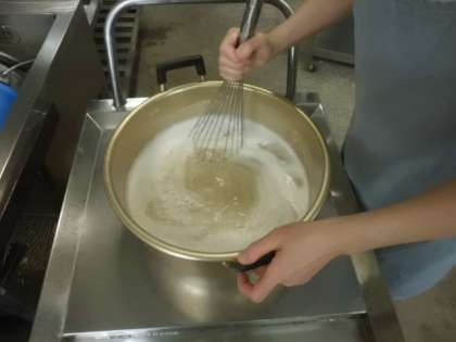 スチコン新献立です。ういろうとは,小麦粉を蒸してできた,もちもちとした和菓子です。給食では,米粉,黒砂糖,砂糖を混ぜて作ります。写真は,よく混ぜて,だまが残らないように生地をザルでこしているところです。